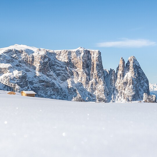 Unendliche, glitzernde Weiten, eingerahmt von den angezuckerten Spitzen der Dolomiten – das erwärmt auch im Winter das Herz.