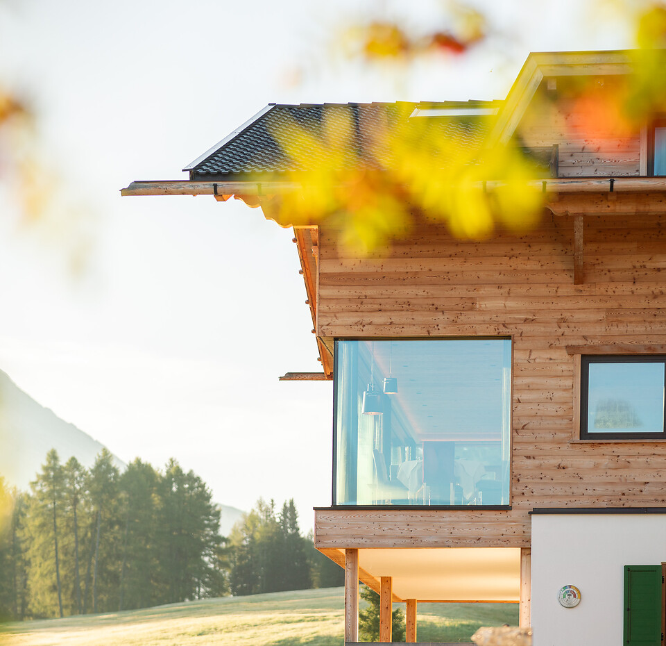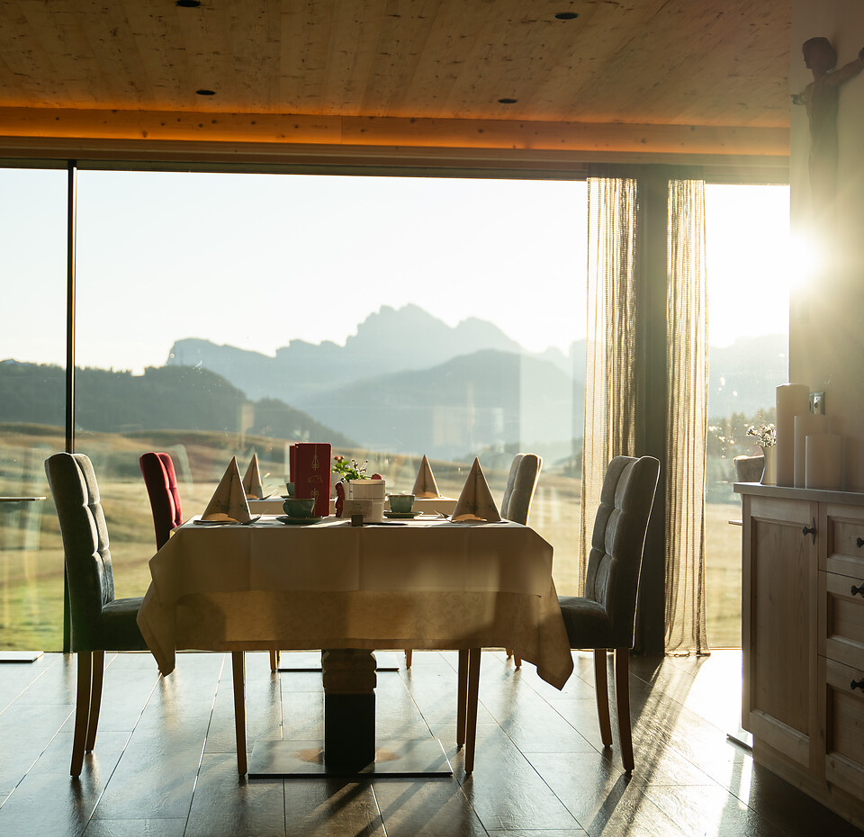 Zwei große Panoramafenster bieten einen unvergleichbaren Blick auf das Lang- und Plattkofelmassiv.