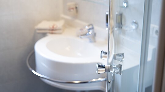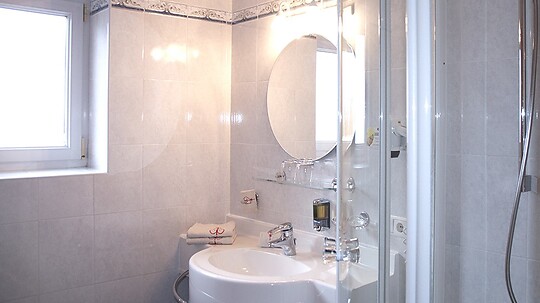 Zimmer mit Komfort-Einzelbett. Badezimmer mit Dusche, WC, Haartrockner. Kuschliger Bademantel, TV, Zimmertresor.