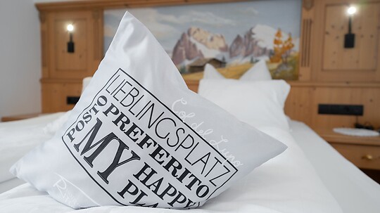 Neues Eck-Doppelzimmer, Eichen-Holzboden, Südbalkon, Blick zum Plattkofel, Tageslicht-Bad mit WC, Dusche, Bidet, Haartrockner, Kosmetikspiegel, Bademantel; TV,...
