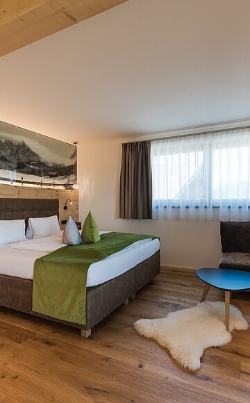 Doppelzimmer, Balkon mit Blick zu Lang-und Plattkofel, Eichen-Holzboden, Sitzecke, Bad mit WC, Dusche, Kosmetikspiegel, Haartrockner, Bademantel; TV, Zimmertresor, Telefon.