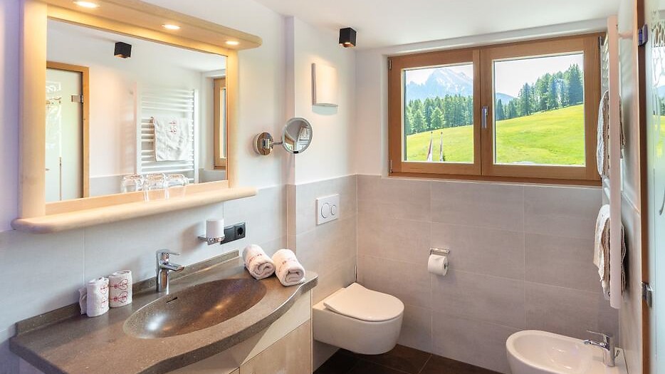 Doppelzimmer, Panoramablick zu den Dolomiten, Südbalkon, Sitzecke, Bad mit WC, Dusche, Kosmetikspiegel, Haartrockner, Bademantel; TV, Zimmertresor, Telefon
