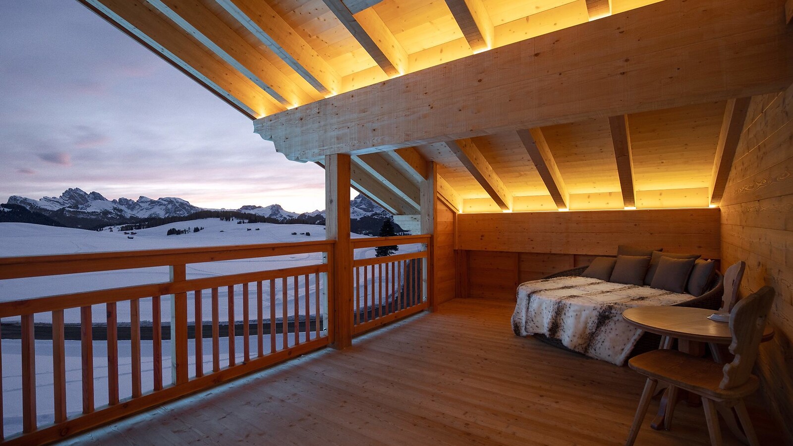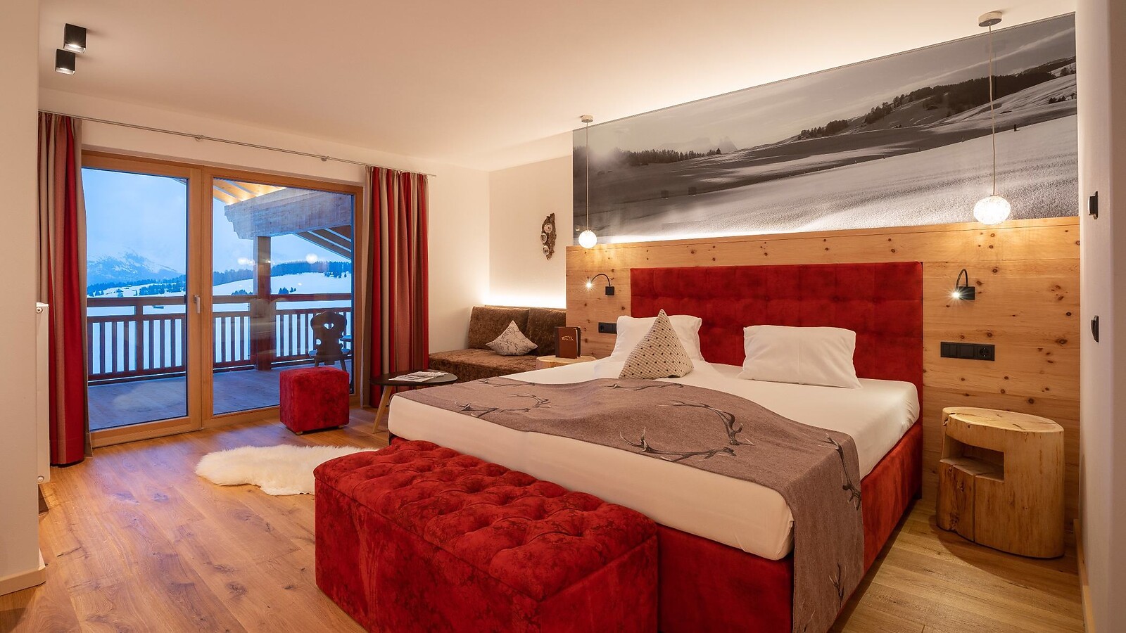 Camera doppia, balcone con vista su Sassolungo e Sassopiatto, angolo soggiorno, bagno con WC, doccia, specchio cosmetico, fon, accappatoio; TV, cassaforte, telefono.