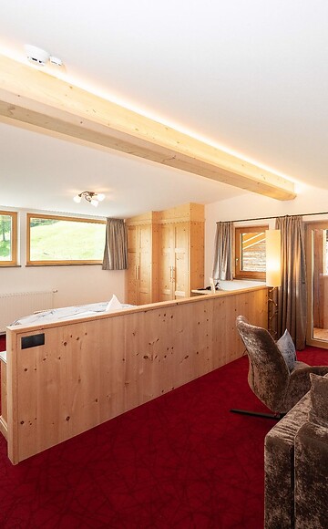 Camera doppia, vista panoramica sui Dolomiti, balcone sud, angolo soggiorno, bagno e WC, doccia, specchio cosmetico, fon, accappatoio; TV, cassaforte, telefono